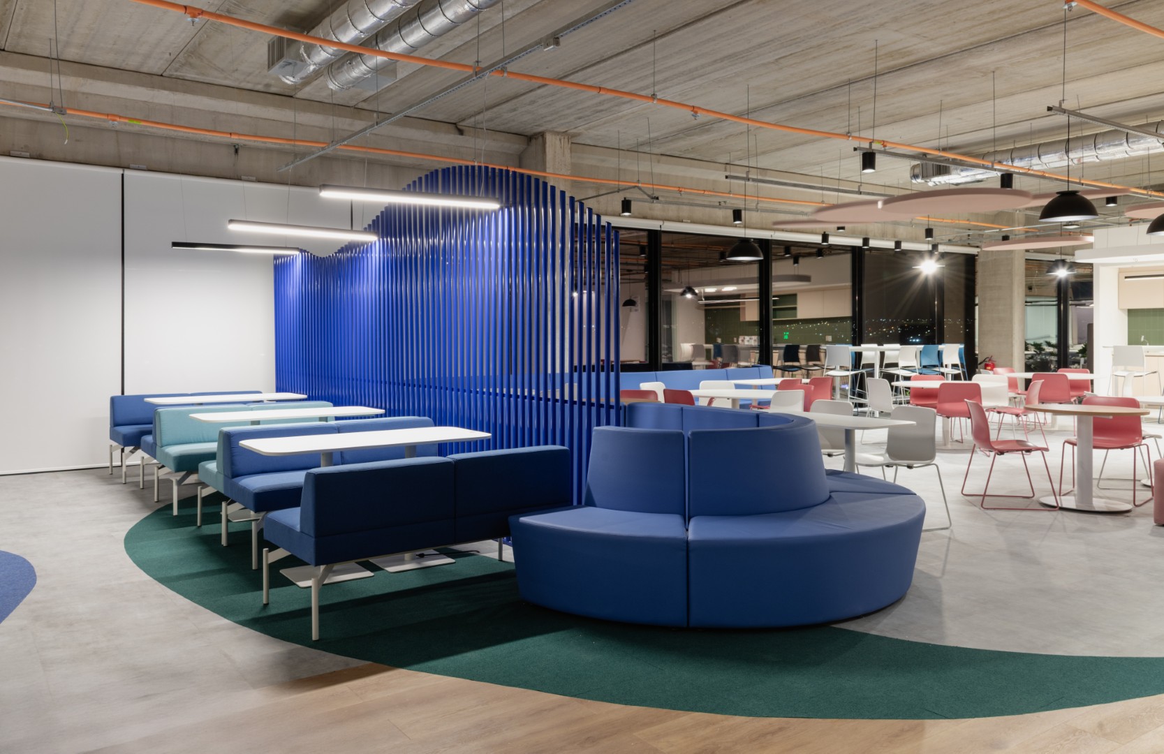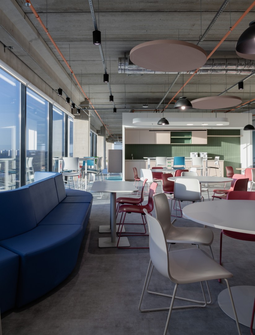 Articulando esses dois ambientes, um grande café atua como espaço central de convivência, encontros e eventos, conectando as áreas de trabalho e estimulando a troca entre usuários. O projeto inclui ainda um auditório para eventos e apresentações, uma arena integrada ao coworking para treinamentos e palestras, além de uma sala envidraçada equipada com tecnologia para estudos, experimentação e desenvolvimento de novas propostas.