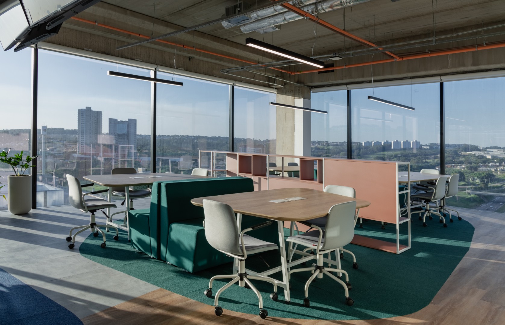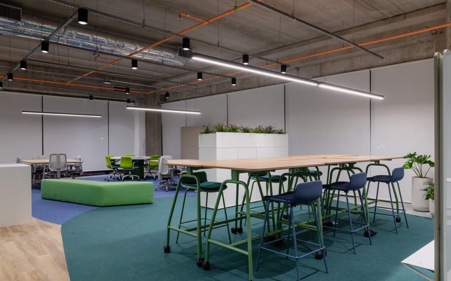 O projeto propõe a implantação de um Hub de Inovação para uma empresa de infraestrutura e saneamento básico, concebido a partir de um amplo processo de pesquisa e entendimento das dinâmicas de uso do espaço. A proposta organiza o ambiente em dois núcleos principais: uma área formal, dedicada às salas de reunião, e uma área aberta de coworking, equipada com mobiliários adaptáveis que permitem diferentes configurações de trabalho, encontros informais ou reuniões mais reservadas.