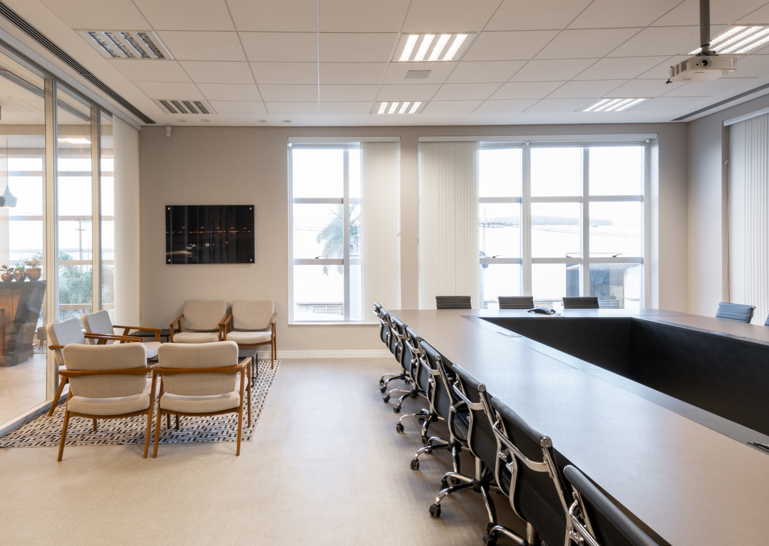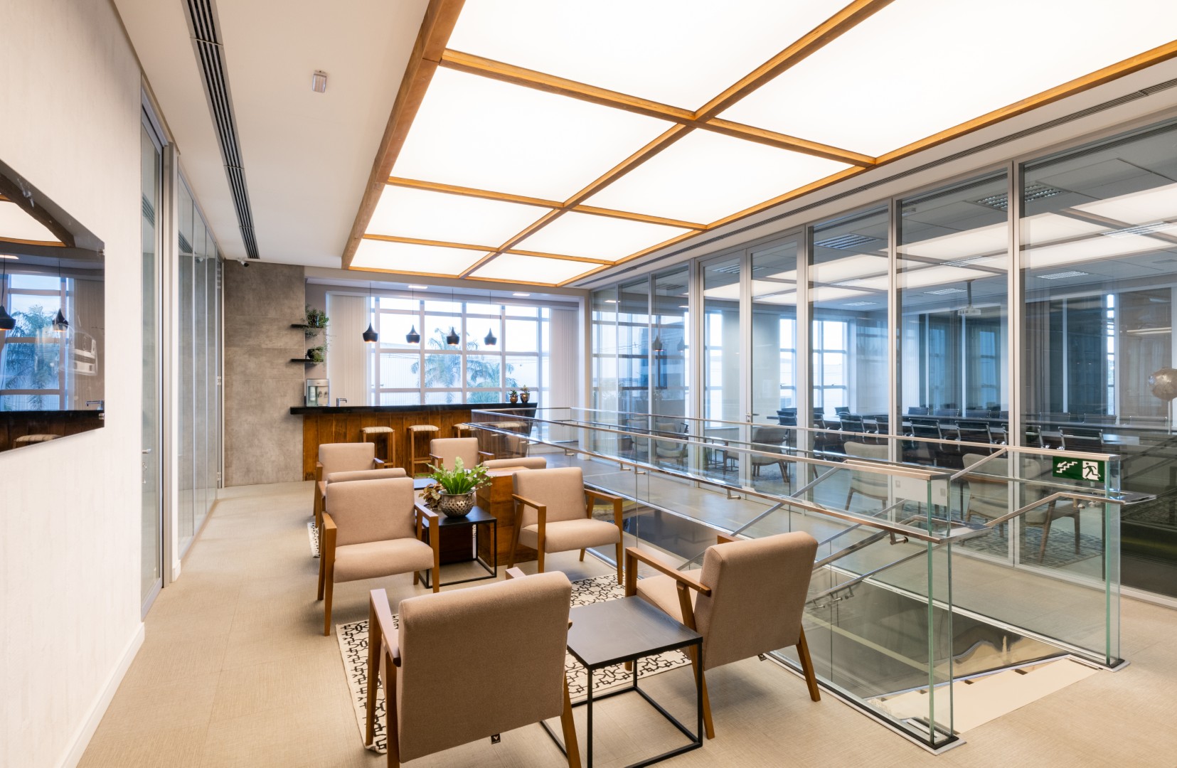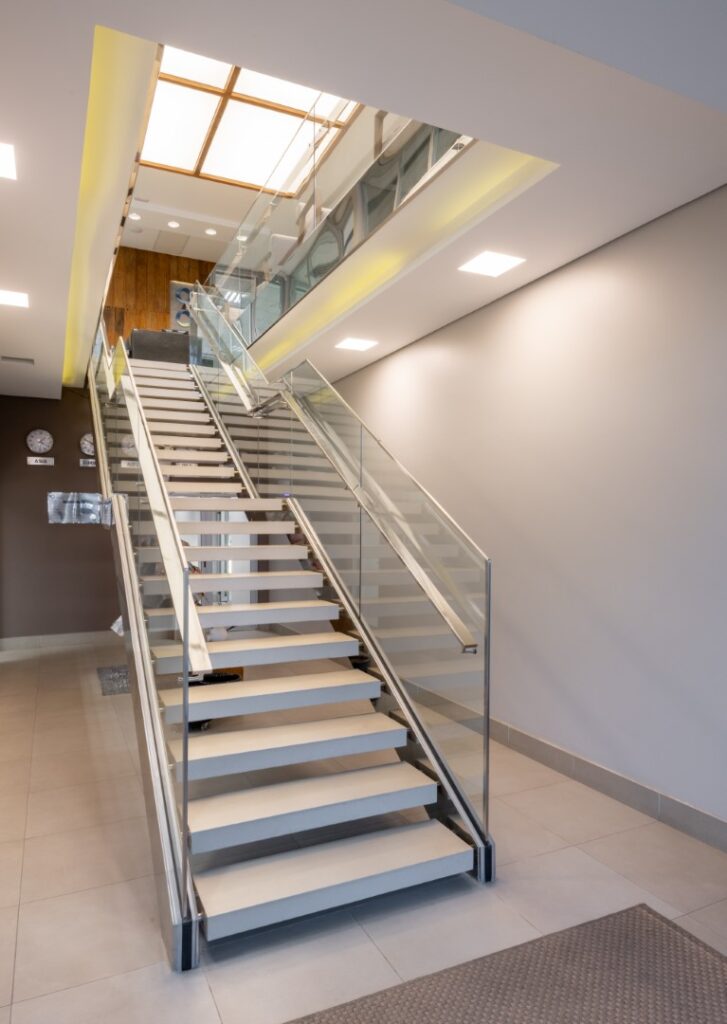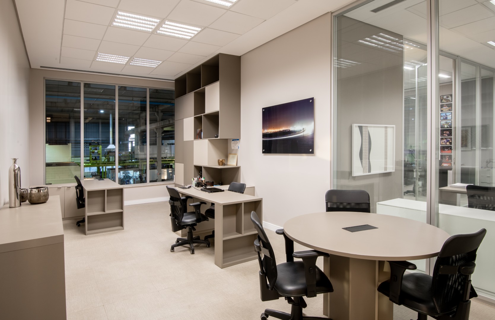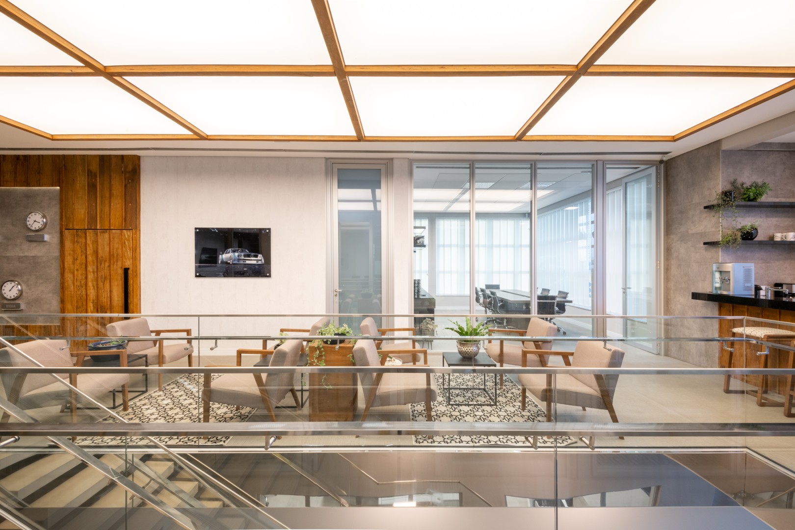 A fachada foi concebida para expressar uma identidade industrial marcante, alinhada ao contexto fabril, mesmo abrigando um ambiente administrativo. Uma escada de destaque conduz ao pavimento superior, onde se concentram os principais ambientes administrativos, reforçando o caráter contemporâneo e a representatividade arquitetônica do conjunto.