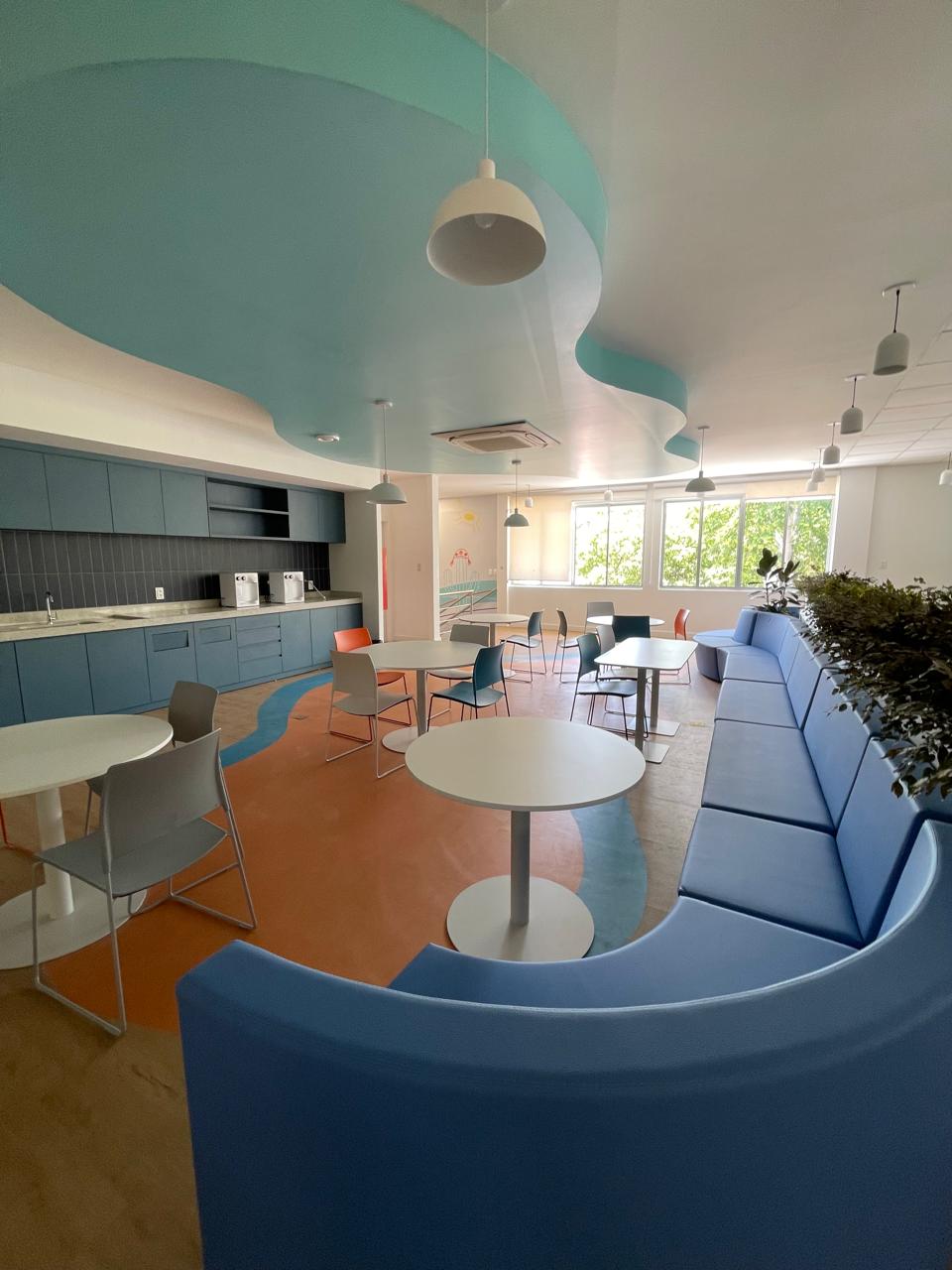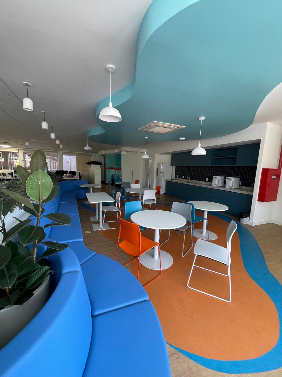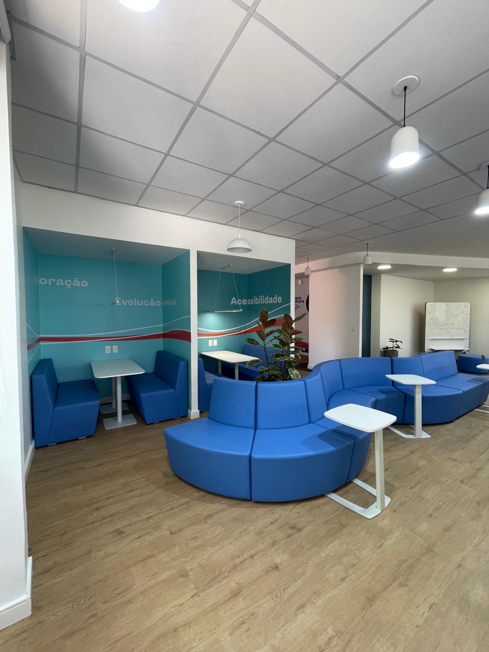 Entre as premissas do cliente estava a criação de salas independentes para a diretoria, posicionadas em uma das extremidades do pavimento. O projeto também buscou reforçar a identidade da empresa na arquitetura, mantendo estruturas existentes e incorporando novos espaços coletivos, como arquibancada, áreas de convivência e ambientes informais destinados à interação entre os colaboradores.