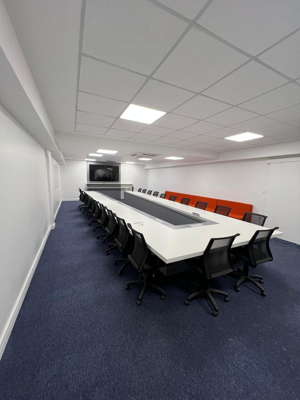 O projeto teve como principal desafio a configuração do pavimento: uma área extensa, porém estreita, com acesso originalmente localizado em uma das extremidades. Para otimizar os percursos e a distribuição dos setores, a entrada principal foi reposicionada para a região central do edifício, organizando de forma mais equilibrada os fluxos e o funcionamento do escritório.